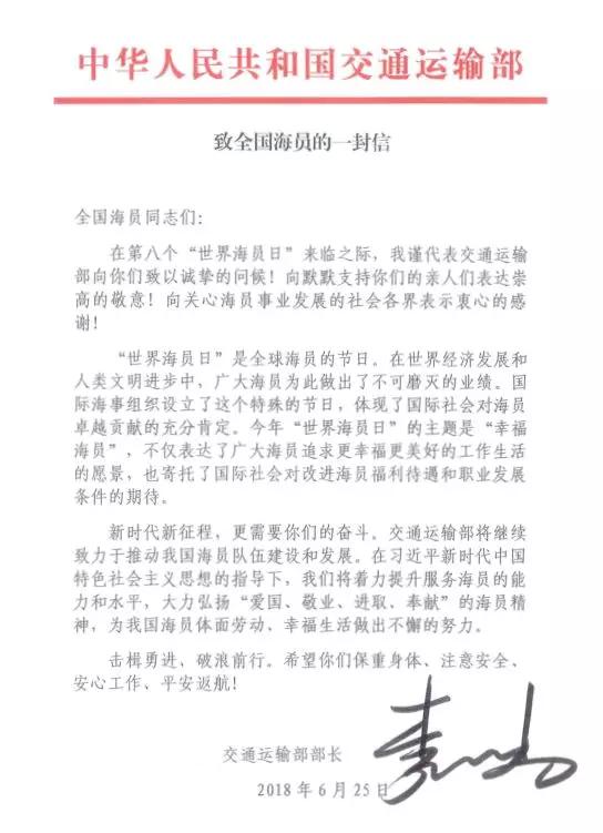 交通運(yùn)輸部部長(zhǎng)李小鵬致信慰問(wèn)全體海員。25日,中國(guó)籍民用船舶、中國(guó)航運(yùn)企業(yè)擁有或光租的非中國(guó)籍船舶將掛滿旗慶祝。在國(guó)外部分港口,中國(guó)駐地使領(lǐng)館將派員登輪慰問(wèn)在港停泊的中國(guó)海員。此外,交通運(yùn)輸部海事局與中國(guó)海員建設(shè)工會(huì)共同組織開(kāi)展了大規(guī)模的“2018年媒體走近海員”新聞采訪活動(dòng),22名媒體記者分乘6艘船舶,和海員同吃同住同工作,身臨其境,現(xiàn)場(chǎng)報(bào)道,向社會(huì)展現(xiàn)當(dāng)代中國(guó)海員的風(fēng)采。