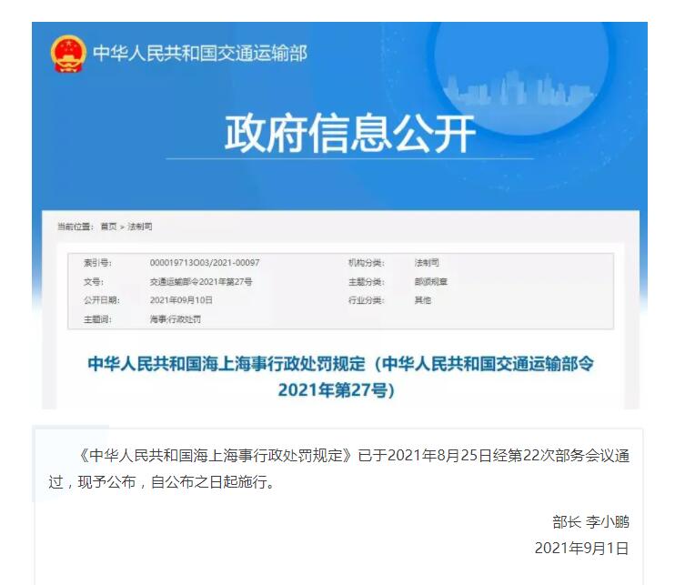 交通運(yùn)輸部發(fā)布《中華人民共和國海上海事行政處罰規(guī)定》